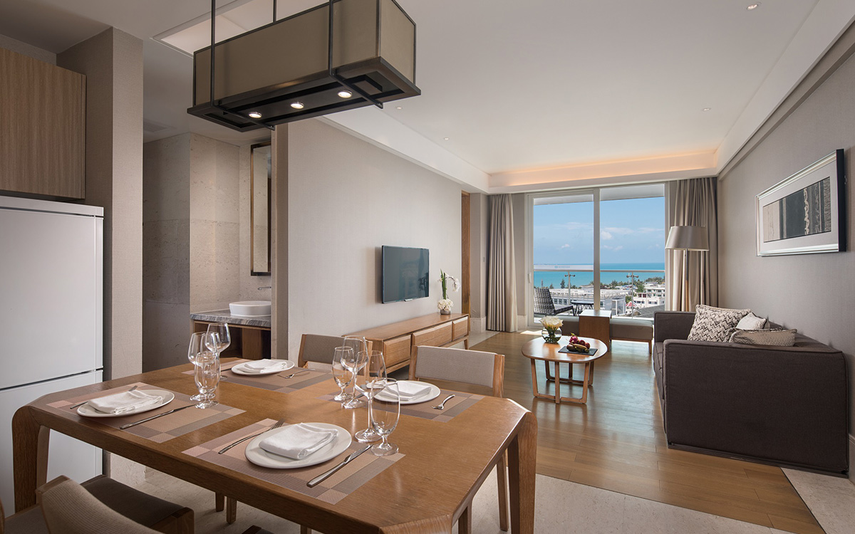 客房设计现代而时尚,色调优雅尊贵,每间套房均有观景阳台和落地窗,从不同角度尽享迷人的南中国海景,在阳台即可观赏日出与夕阳之美,尽享日观海,夜踏浪的浪漫度假时光。