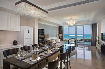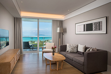 客房设计现代而时尚,色调优雅尊贵,每间套房均有宽阔观景阳台和落地窗,从不同角度尽享美丽的南中国海景,在阳台即可观赏日出与夕阳之美,尽享日观海,夜踏浪的浪漫度假时光。