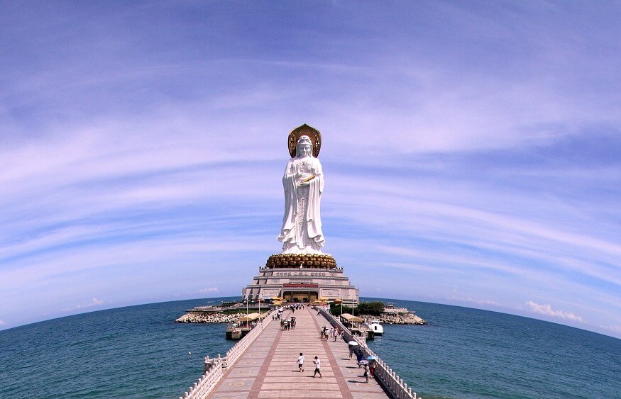 南山踞南海之滨,形似巨鳌,古称鳌山,有观音菩萨坐骑之相。琼州历来就有观音出巡南海之说,观音菩萨在此循声救苦,普度众生之功德事迹,童叟可颂。南山侧望之东瑁、西瑁二岛,相传为观音闻声救难时担土跌落而成。